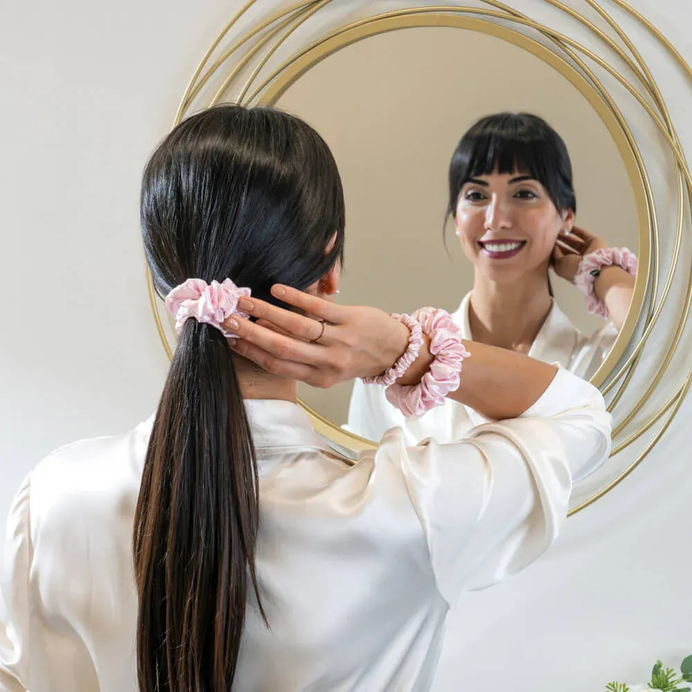 Explorez la sensation de douceur des chouchous en soie Lilacare, spécialement conçus pour diminuer les frottements et protéger vos cheveux en réduisant au minimum les enchevêtrements, les cassures et les frisottis.
